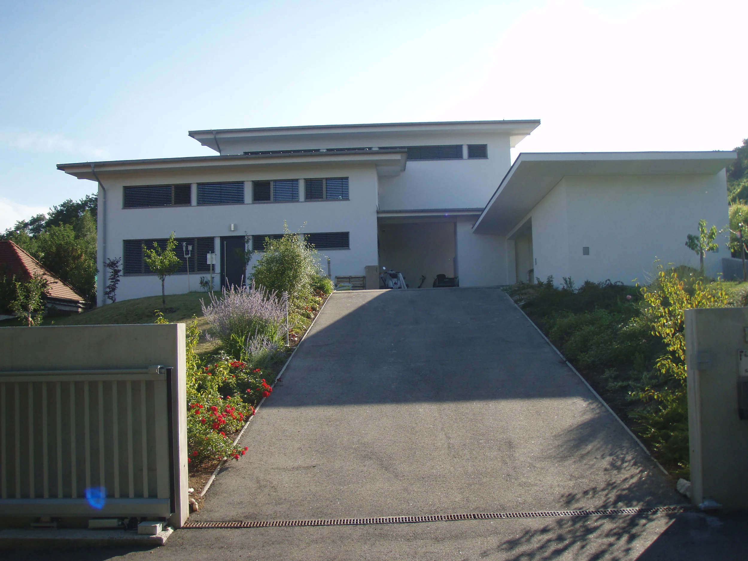 Durch die Platzierung des Hauses an der Nordgrenze des Bauplatzes wird die Gartennutzung optimiert. Überdeckte Bereiche und unbeheizte Nebenwohnflächen maximieren das Wohnerlebnis im Garten. Ein großer südlicher Dachvorsprung schützt die Terrassen vor Regen und die Innenräume vor Überhitzung. Der Gebäudekern wird kompakt gehalten. In Kombination mit den fast ausschließlich süd-orientierten Fenstern wird dadurch ein Passivhausstandard erreicht. Die modulartige Planung ermöglicht einen phasenweisen weiteren Ausbau. Passivhaus, Baubeginn April, 2008